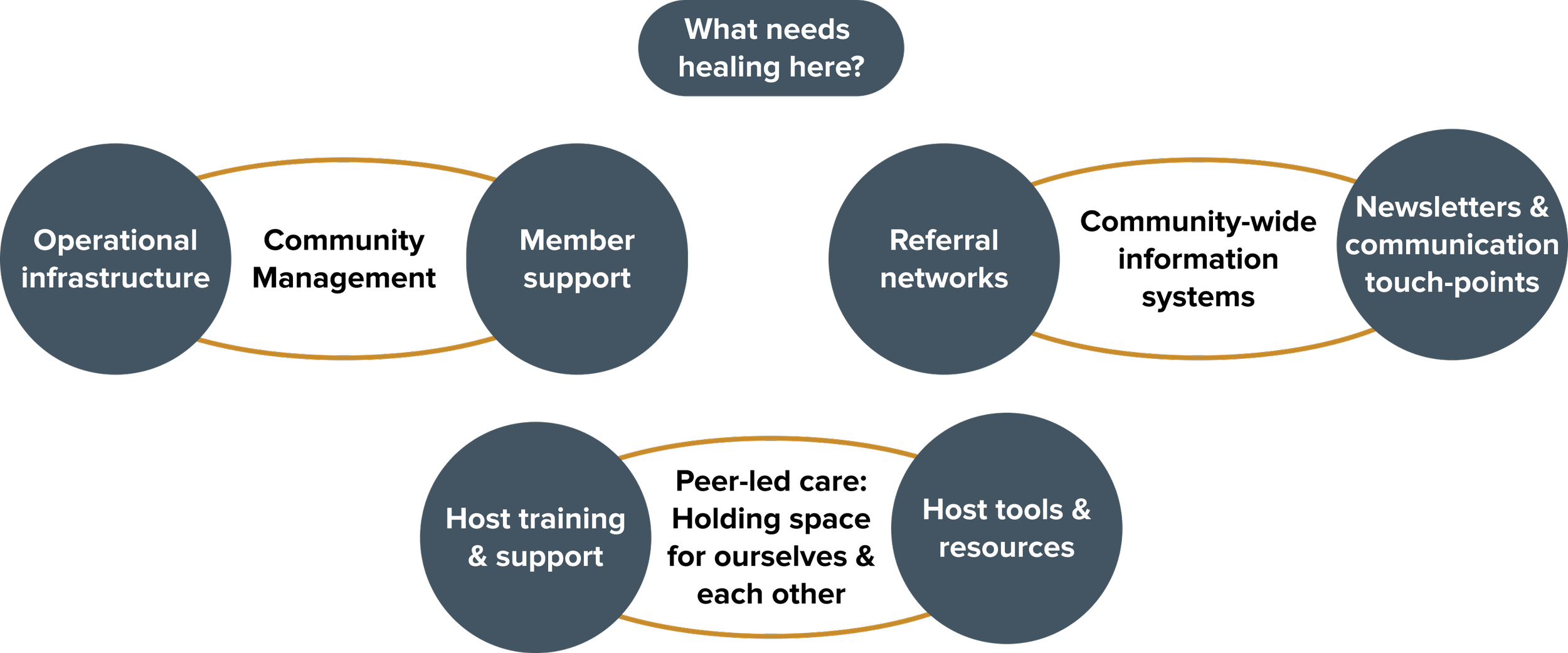 Here, too, leadership development is key: For the role of community managers, we enlist peers rather than professionals, recognizing that lived experience affords a level of credibility and insight that can’t be taught. We develop referral networks and community-wide information systems, scaffolding a user's journey from their point-of-entry to sustained engagement over time, and ensuring that we’re able to meet potential members where they are, in language that’s familiar and accessible.