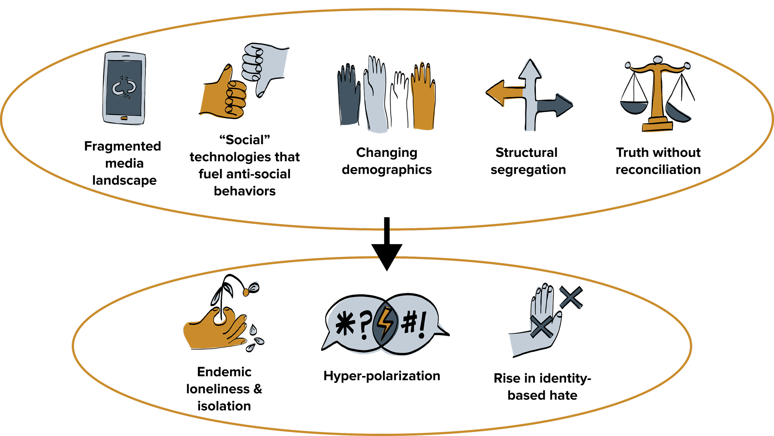 As has been well-documented, we're living in an era marked by endemic loneliness and isolation, hyperpoliticization and polarization, and a rise in identity-based hate. The drivers are many and well-documented: a fragmented media landscape and a blurring of truth and fiction; shifting demographics, intersecting with long-standing histories of structural segregation and rising income inequality; technologies ostensibly meant to connect that too often fuel the opposite.